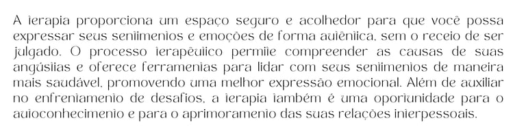 Meu compromisso é com a busca contínua por conhecimento e aperfeiçoamento, visando proporcionar um serviço de saúde mental de qualidade e alinhado às necessidades individuais de cada pessoa.
